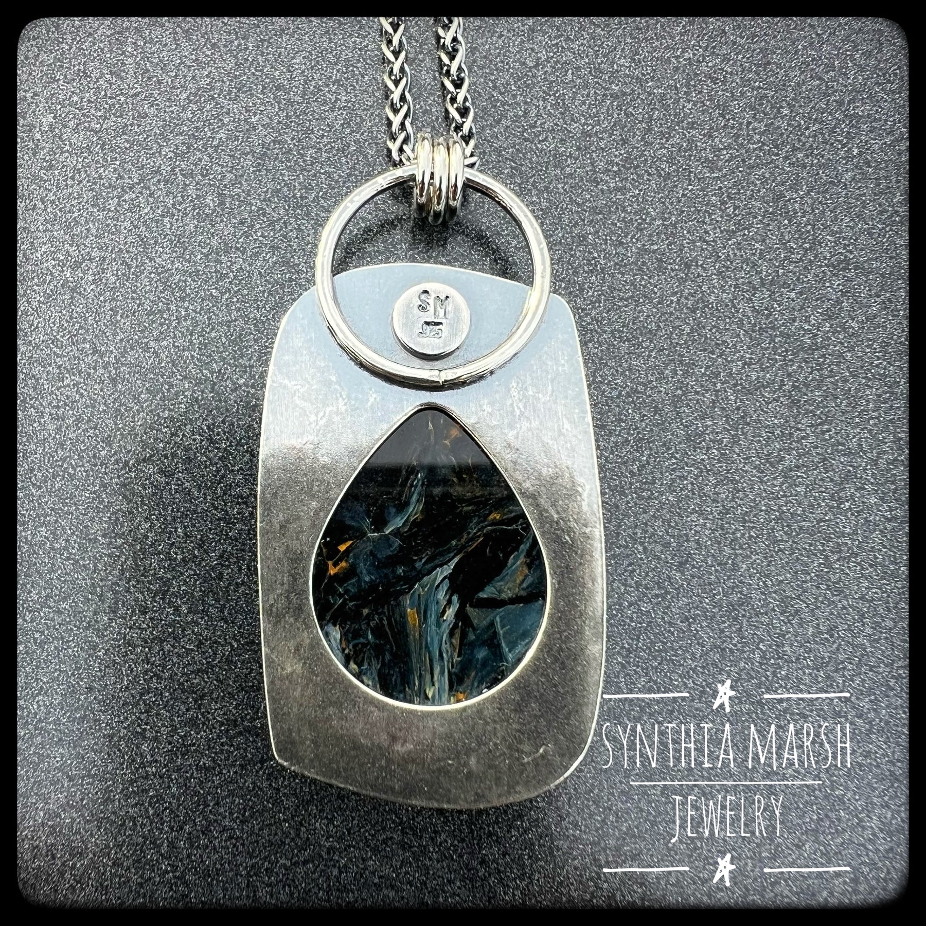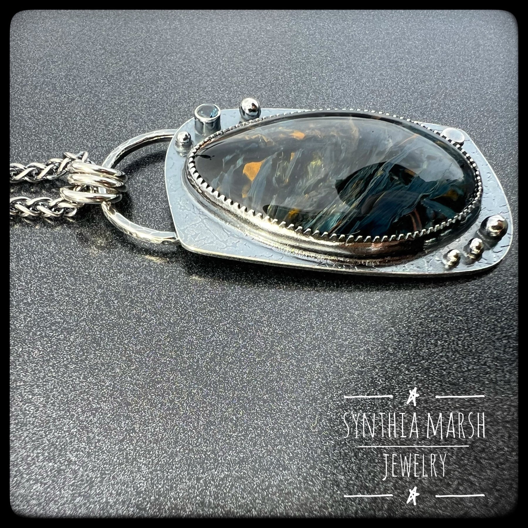 • This rounded teardrop shaped Pietersite from Namibia is made up of shades of blue, black and gold. The chatoyancy of this gorgeous stone dances with the light and is complimented by sterling silver embellishments: sterling silver droplets, button and a coordinating 3mm blue sapphire. The Pietersite is hand-set into a serrated fine silver bezel. The backplate has a vein texture that mirrors the veins of color in the stone.