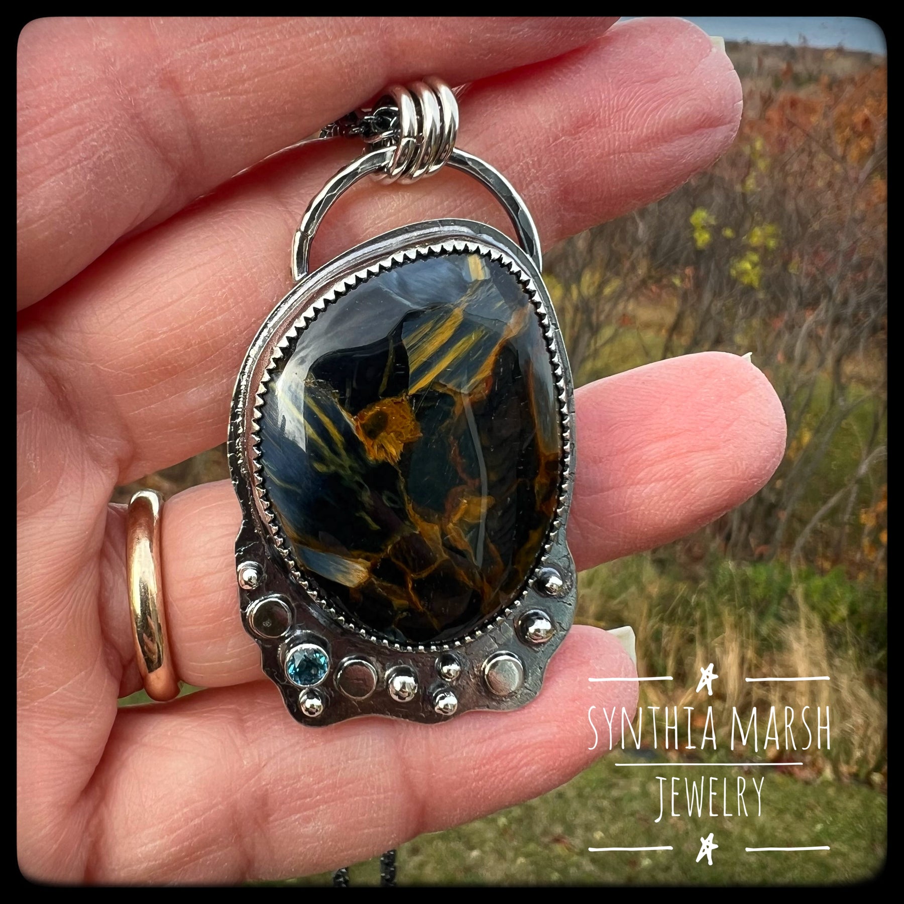• This freeform shaped Pietersite from Namibia is made up of shades of blue, gold and black. The chatoyancy of this gorgeous stone dances with the light and is complimented by sterling silver embellishments: sterling silver droplets, buttons and a coordinating 3mm blue sapphire. The Pietersite is hand-set into a serrated fine silver bezel. The backplate has a light vein texture that mimics the veins of color in the stone.